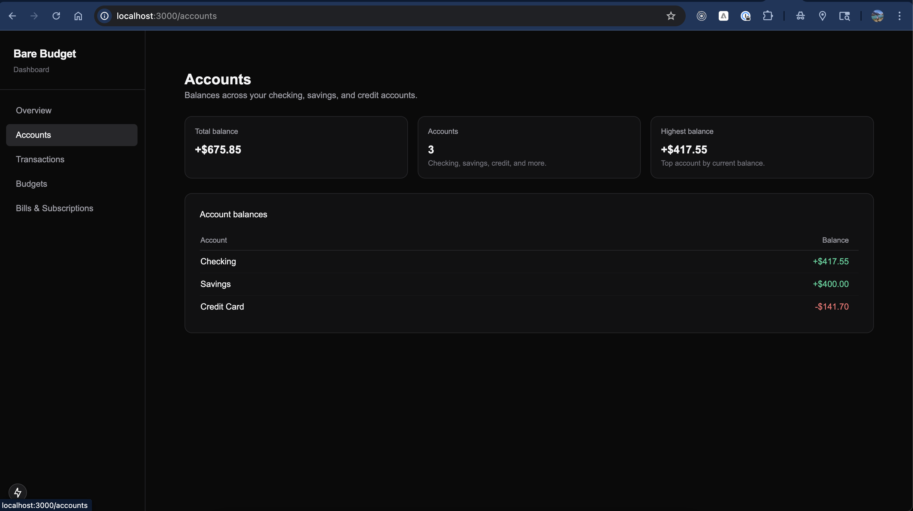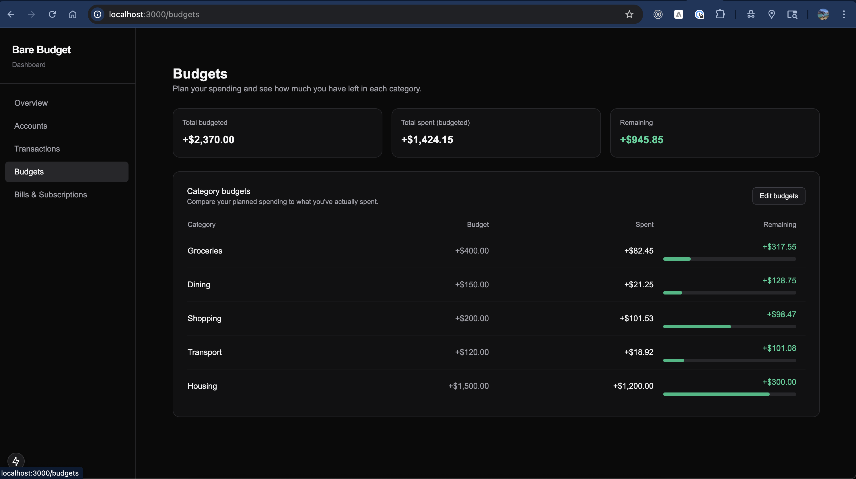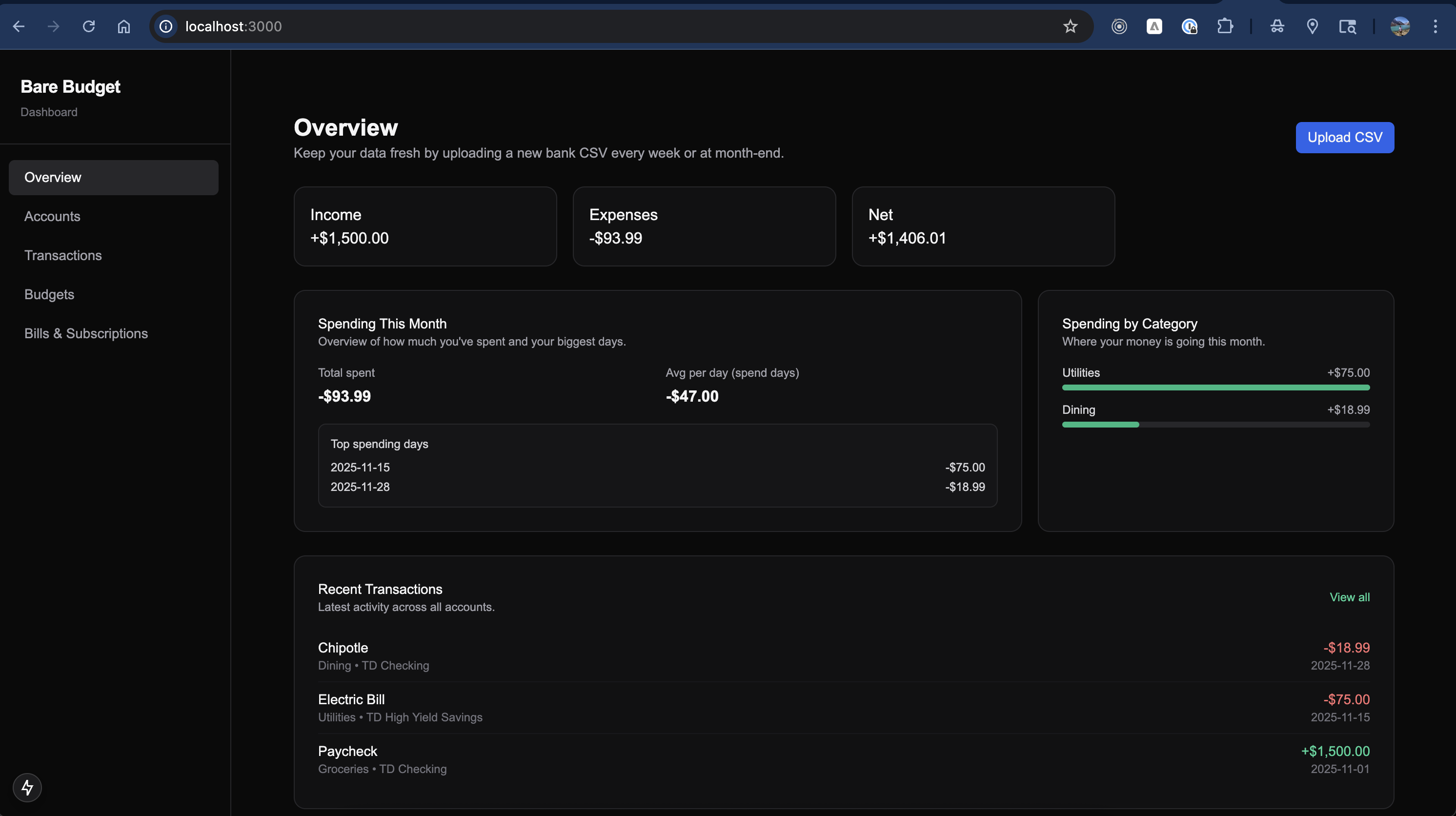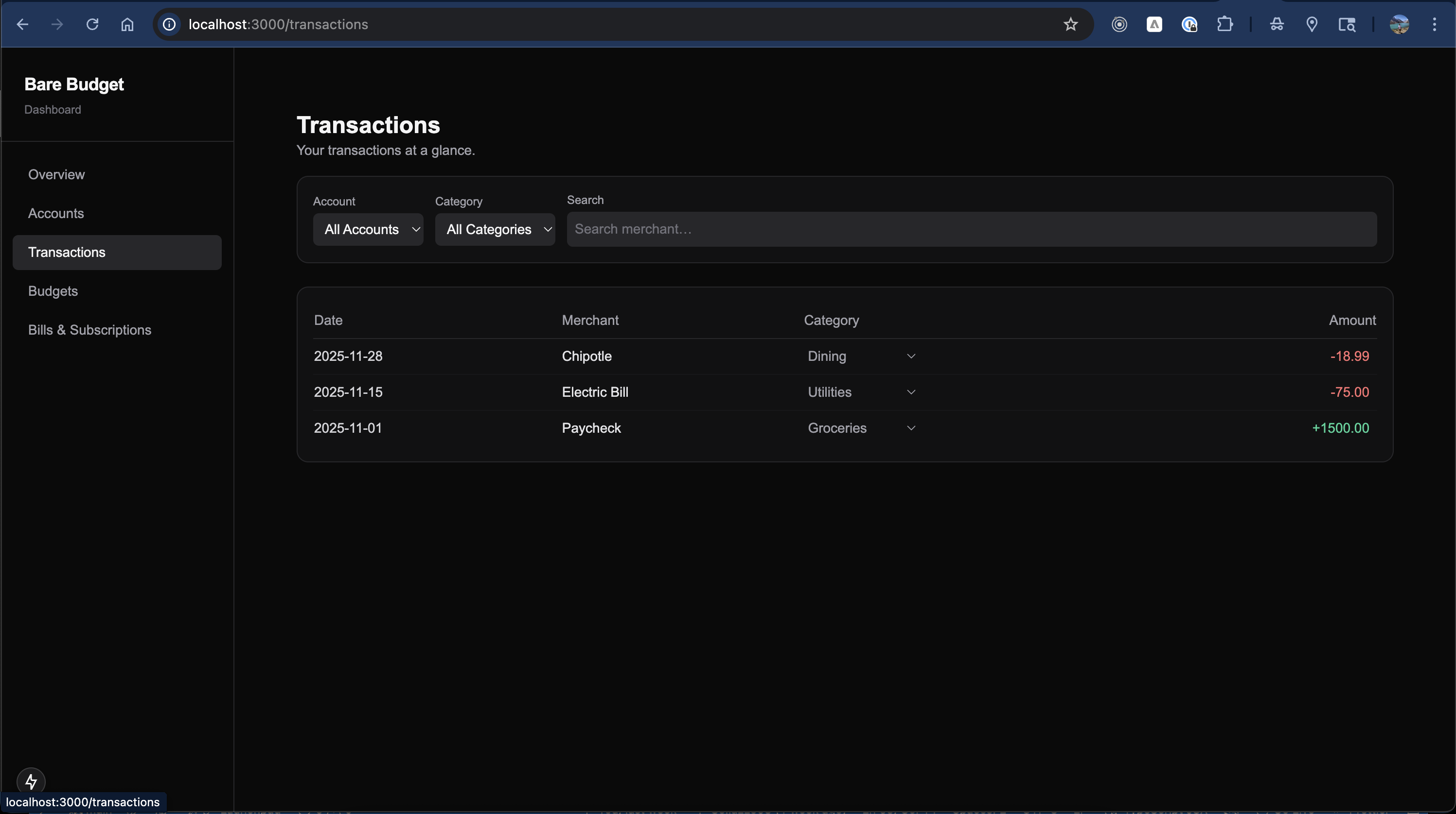 View on GitHub→BareBudget is a full-stack budgeting platform that helps users understand their spending trends over time.